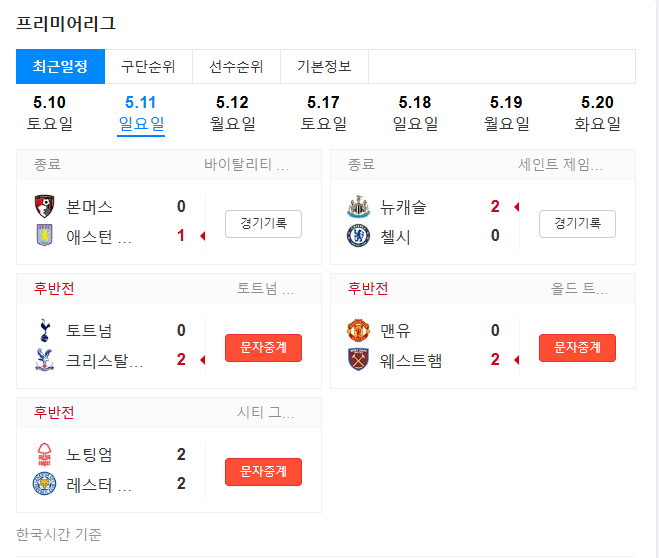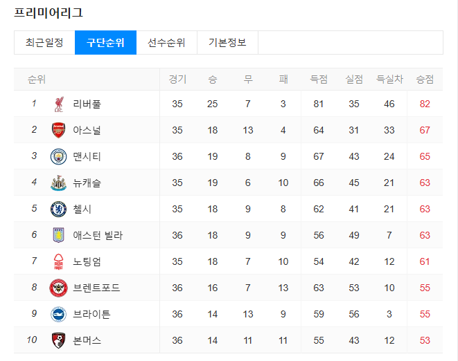 프리미어리그 순위 변화 (2025년 5월 11일 기준)