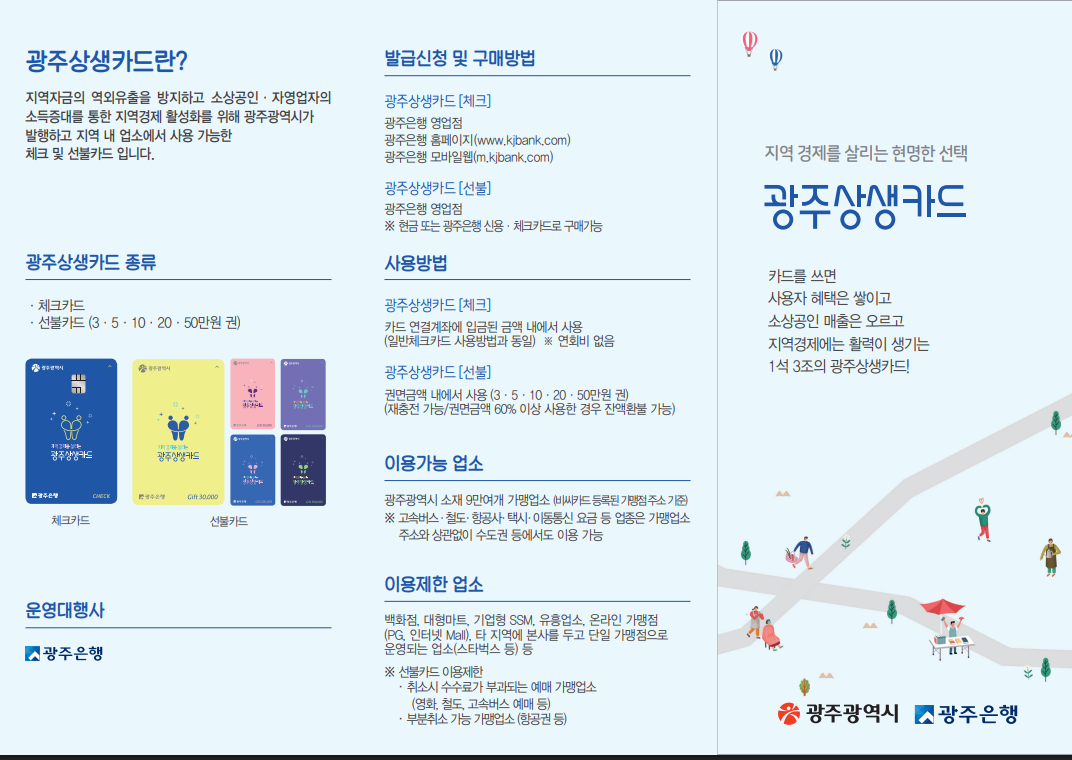 동네 식당, 카페, 편의점, 전통시장 등 소상공인 가맹점 중심으로 사용 가능하며 광주은행을 통해 발급 및 충전할 수 있습니다.