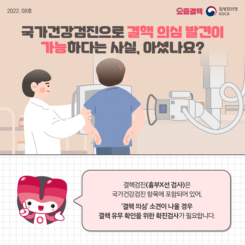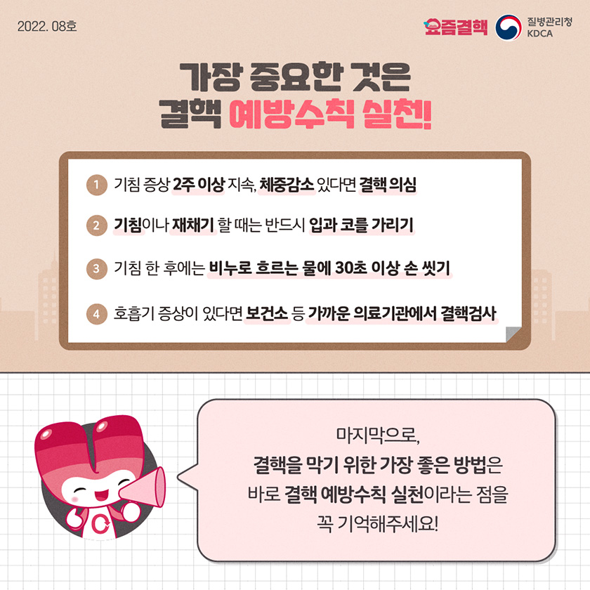 결핵은 예방과 조기 발견이 중요한 질병입니다. 결핵이 의심되면 지체하지 말고 가까운 의료기관에서 검사받고, 치료를 시작해 건강을 지키세요.