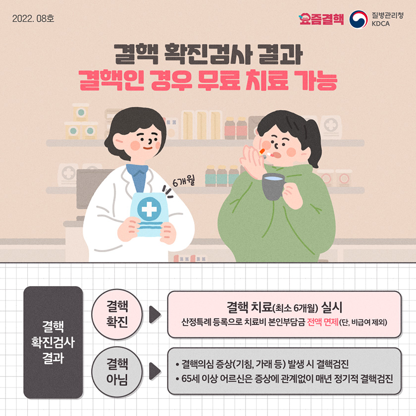 결핵 확진 환자는 보건소에서 무료 치료 지원을 받을 수 있으며, 조기에 발견된 결핵은 빠르고 효과적으로 치료할 수 있습니다.