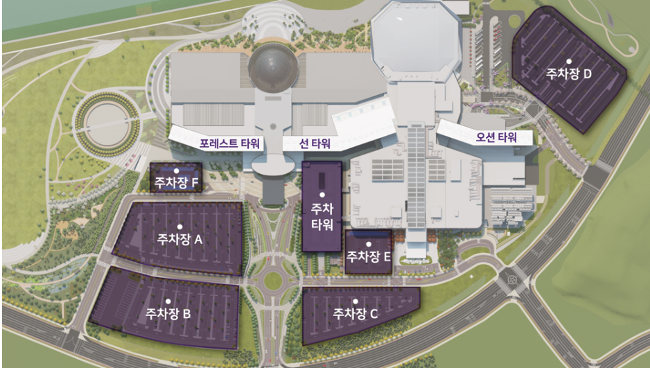3,400대 이상의 차량을 수용할 수 있는 주차장이 구비되어 있으며, 공연 관람객에게는 최대 6시간까지 무료 주차가 제공됩니다. 리조트의 무인 정산 시스템을 통해 빠르고 편리한 주차 서비스를 이용할 수 있습니다.