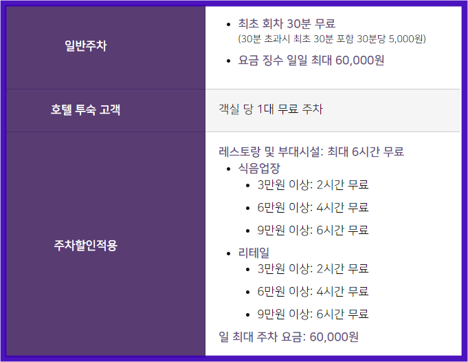 ● 일반주차 : 최초 30분은 무료 이후 30분마다 5,000원이 부과 /하루 최대 요금은 60,000원