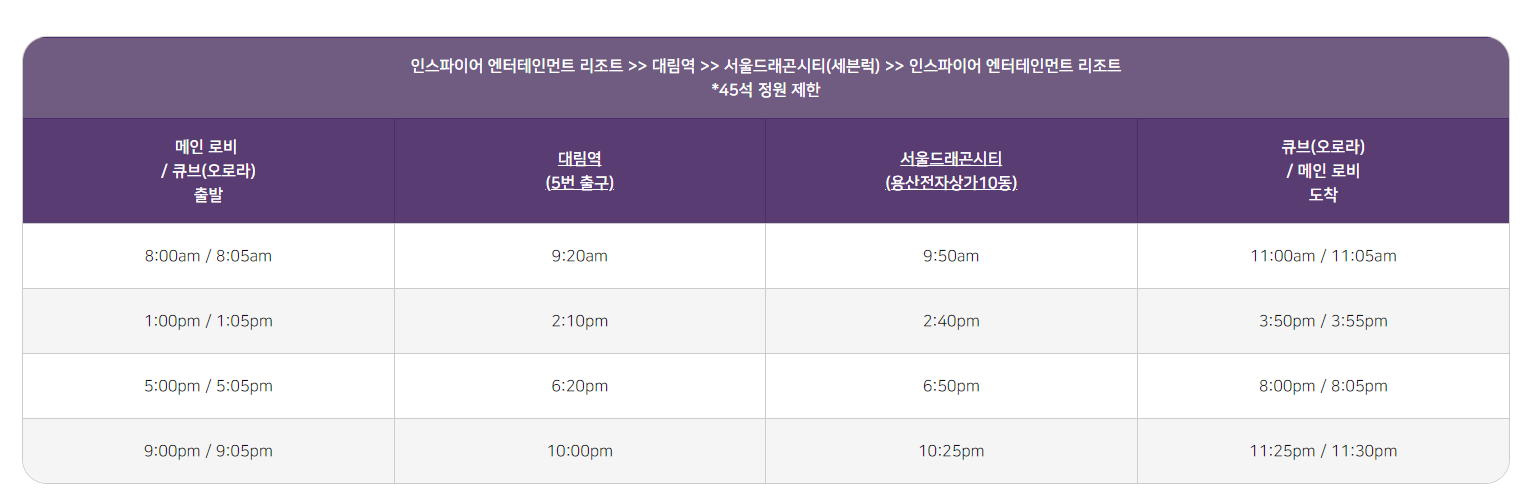 ● 서울 드래건시티 (용산 전자상가 10동) : 오전 9시 50분 첫 차 출발 / 4회 운행