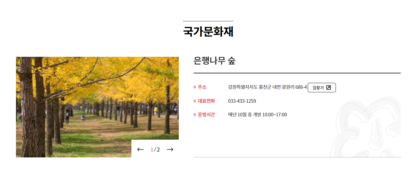 매년 10월 한 달간 만 개방되는 홍천 은행나무숲은 가을의 아름다움을 만끽할 수 있는 최고의 장소입니다.