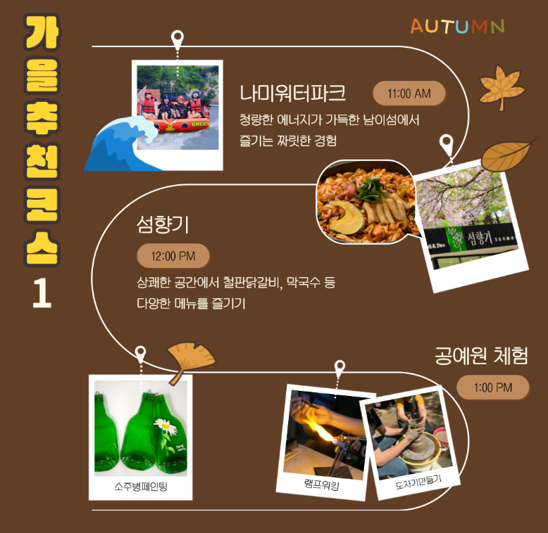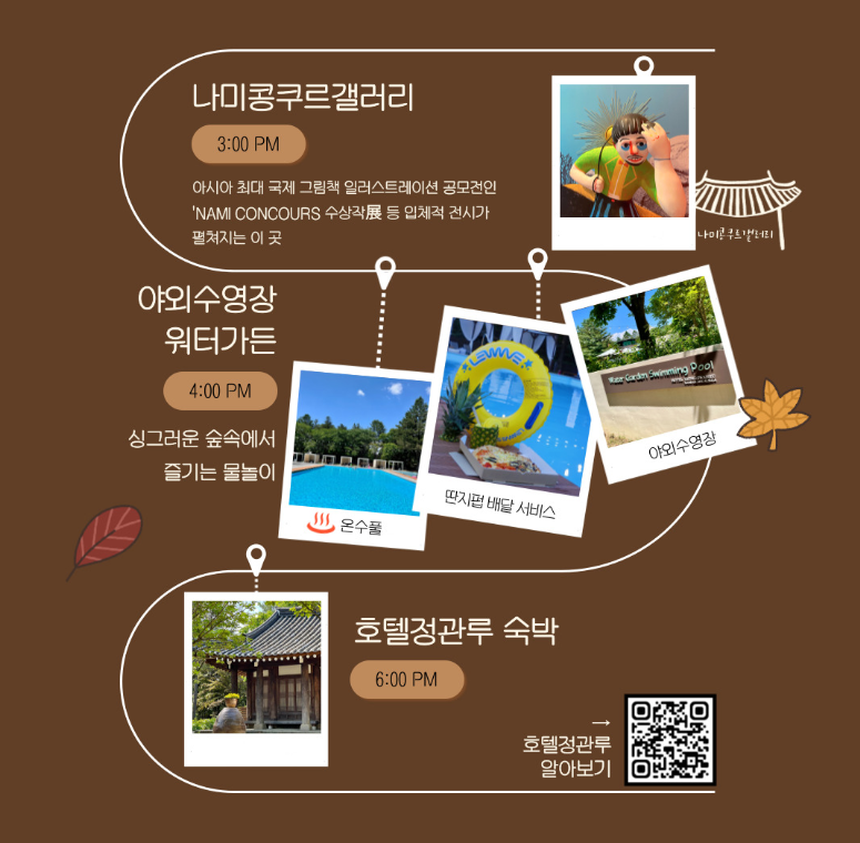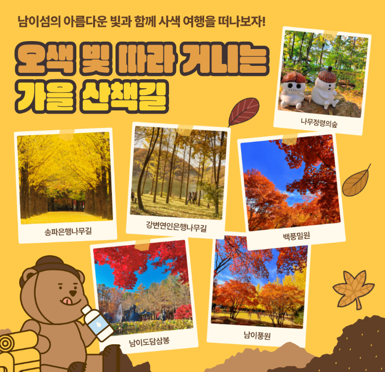 주말에는 많은 방문객이 몰리기 때문에 평일 방문을 추천합니다. 아이와 함께라면 그림책 놀이터와 전시 프로그램도 놓치지 말고 즐겨보세요. 남이섬의 단풍 절정기를 놓치지 않고 방문해 특별한 가을 추억을 남겨보세요.