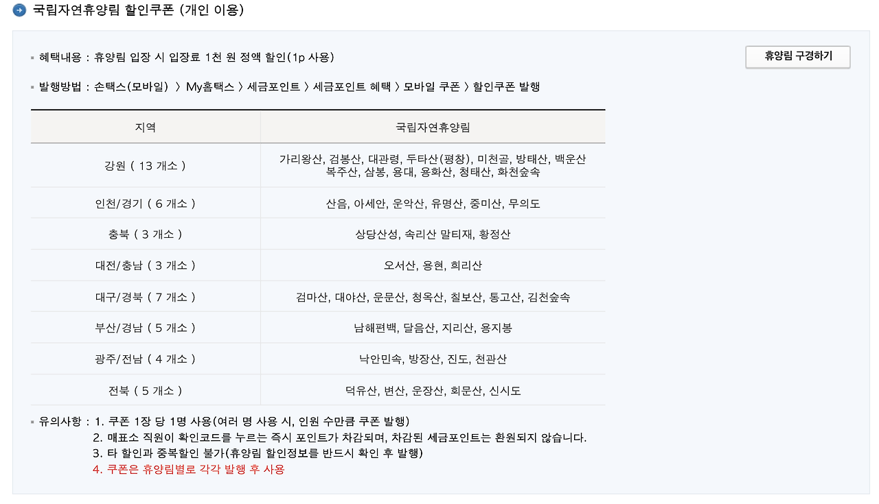 국립자연휴양림에서는 할인 쿠폰도 제공하고 있습니다.