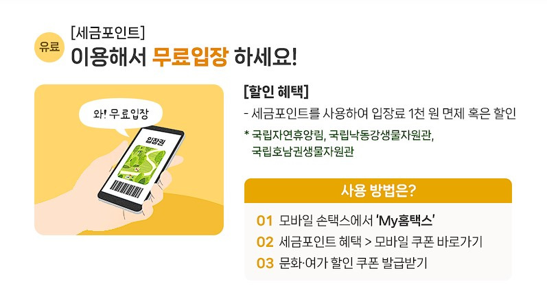 세금 포인트를 사용하여 무료로 입장하는 방법은 다음과 같습니다. 먼저, 모바일 손택스 앱을 다운로드한 후, 'My홈택스' 메뉴로 이동합니다. 그 다음, 세금 포인트 혜택을 선택하고, 모바일 쿠폰을 발급받습니다.
