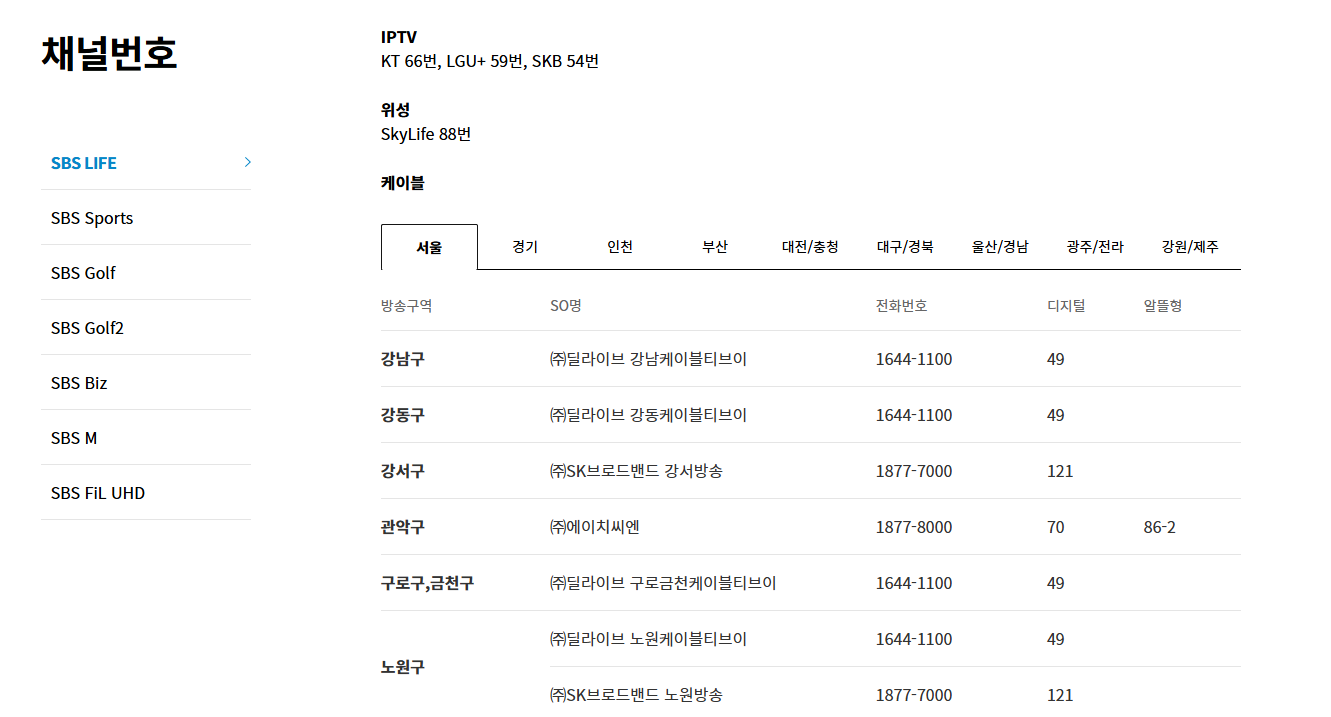 | 방송사 | SBS채널 M 번호 | SBS FiL 채널번호 |